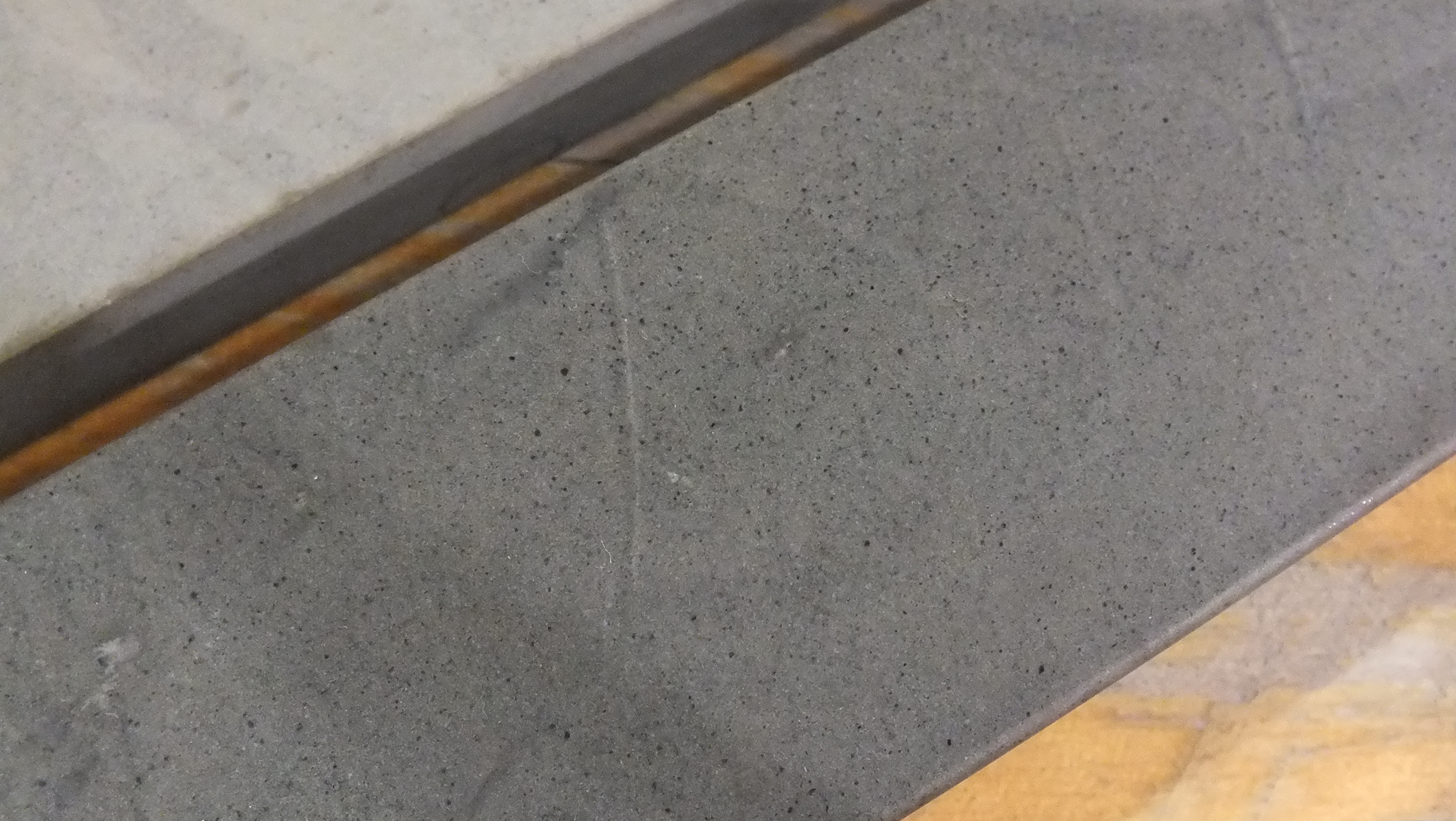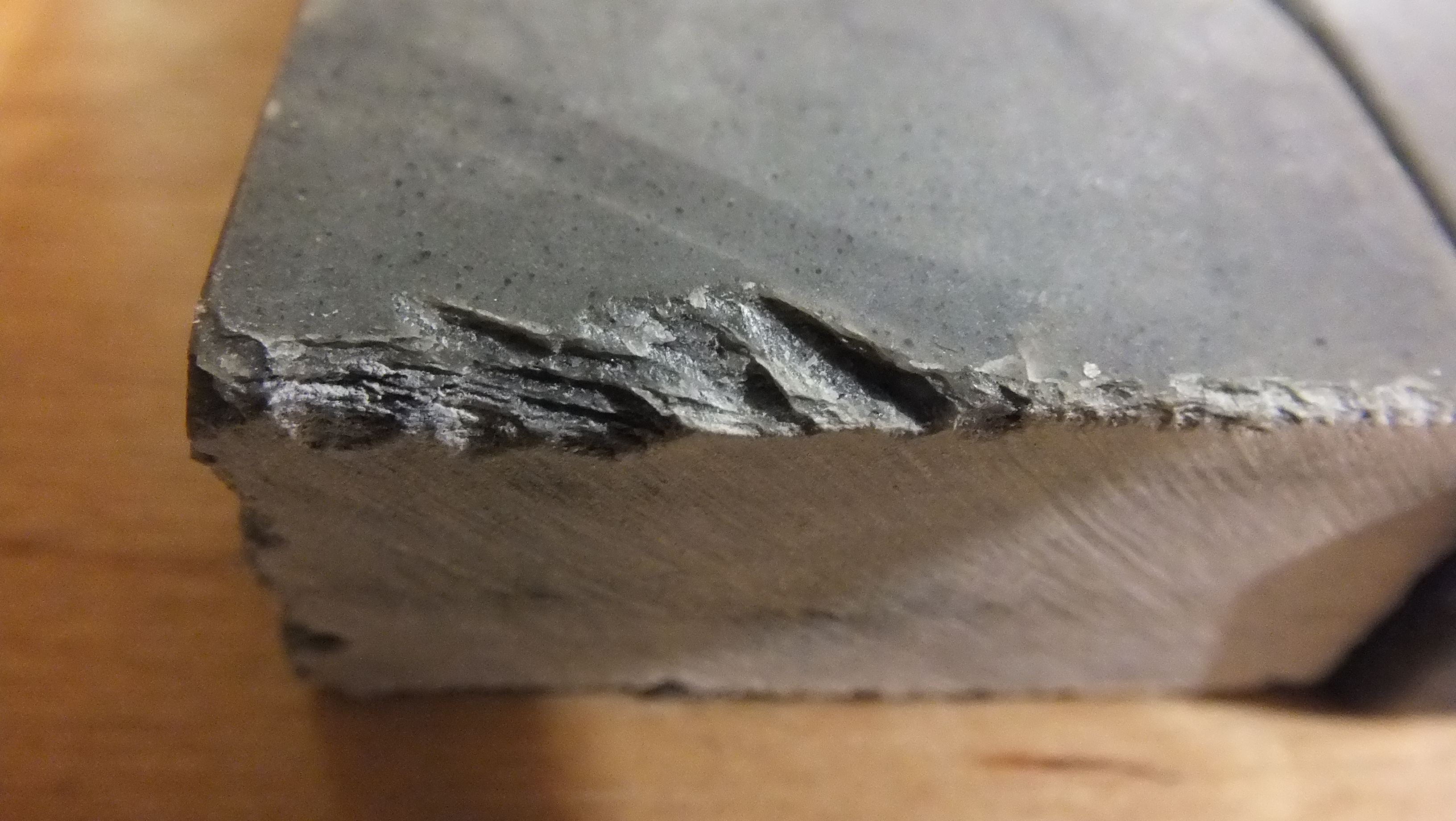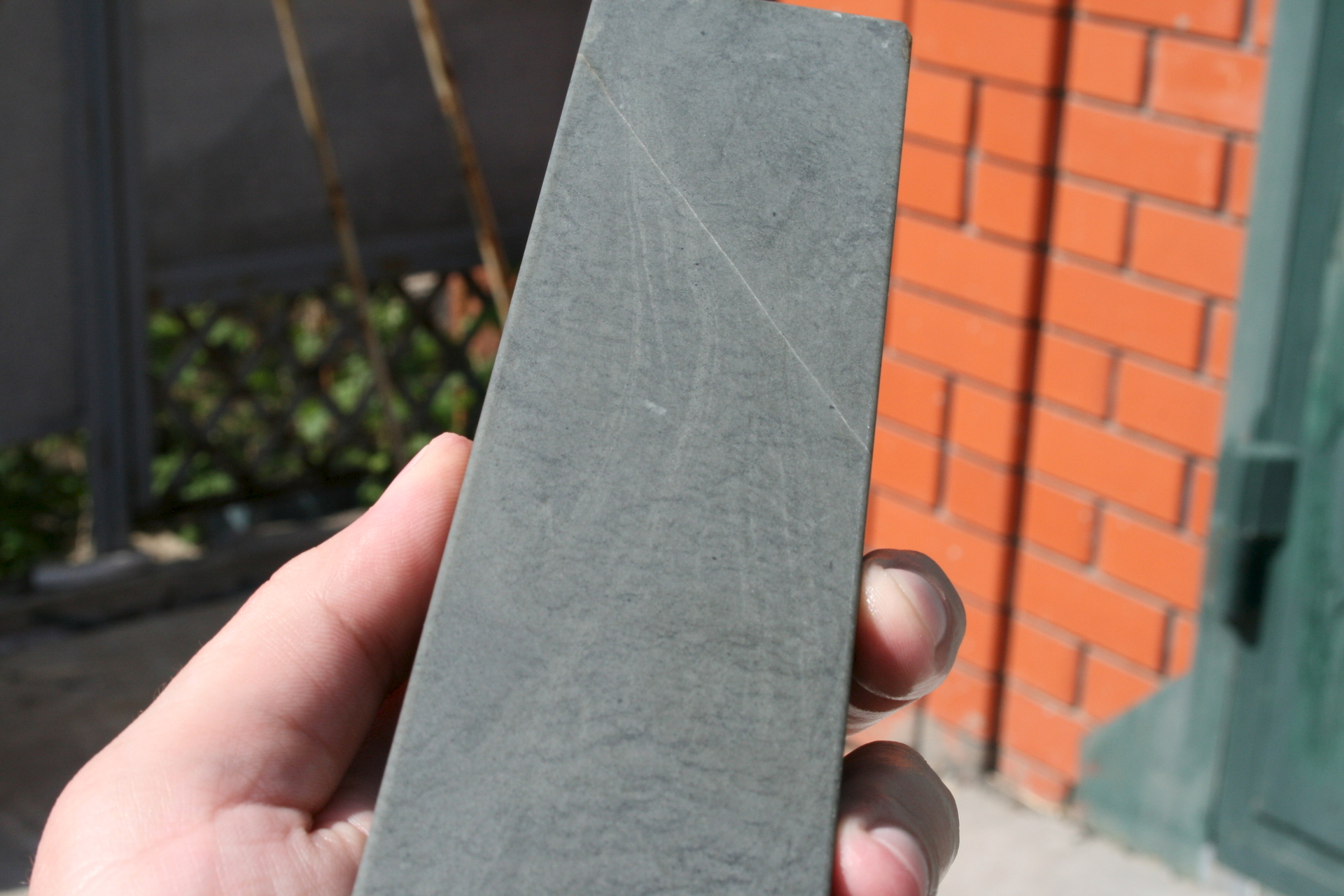 Много пробовал этот камень и обнаружились некоторые странные моменты — хотя он и менее плотен, чем мой камбриан, однако способность выглаживаться, при работе с малым давлением, с водой и водными суспензиями, у него оказалась куда больше, причём в разных вариантах притирки. Прилипание фаски становится слишком сильным.